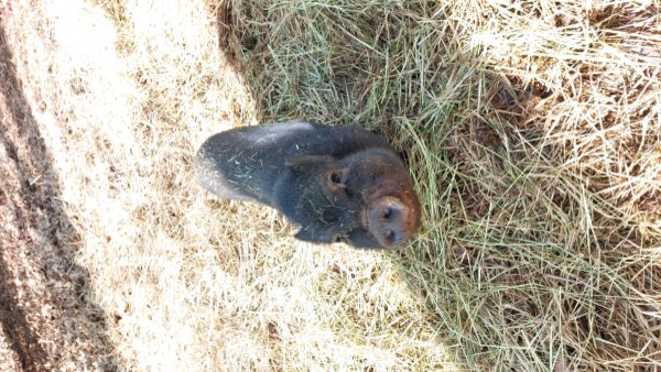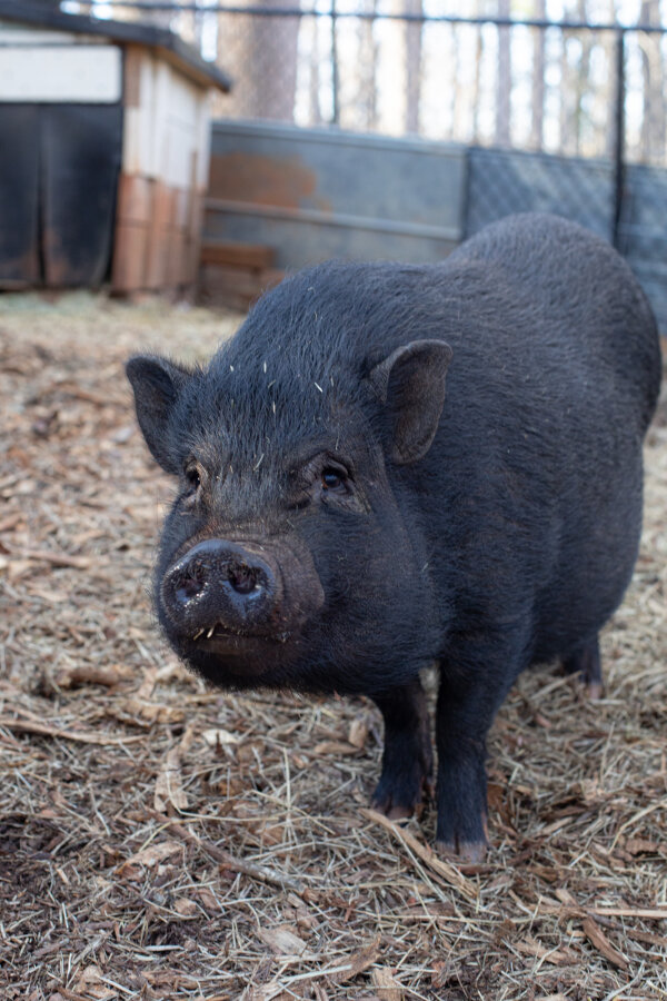 9/8/25: Still available! Elvis is a gentle, slightly shy, young pig who is learning to trust people after a rocky start to life. He has come a long way since he was abandoned near a busy road at only 20 weeks old. He had been alone and scared for several weeks before being caught and brought to a BSAS foster home. As he was found in late December/early January 2023 we assume that he was an unwanted Christmas present. He has been showered with love and attention in his foster home and is now much more confident. He loves to be hand-fed with grapes and is a push-over for a belly rub. He is a sweet, gentle soul who will melt your heart. He is in a foster home in Wake County. Come to meet him today!