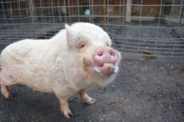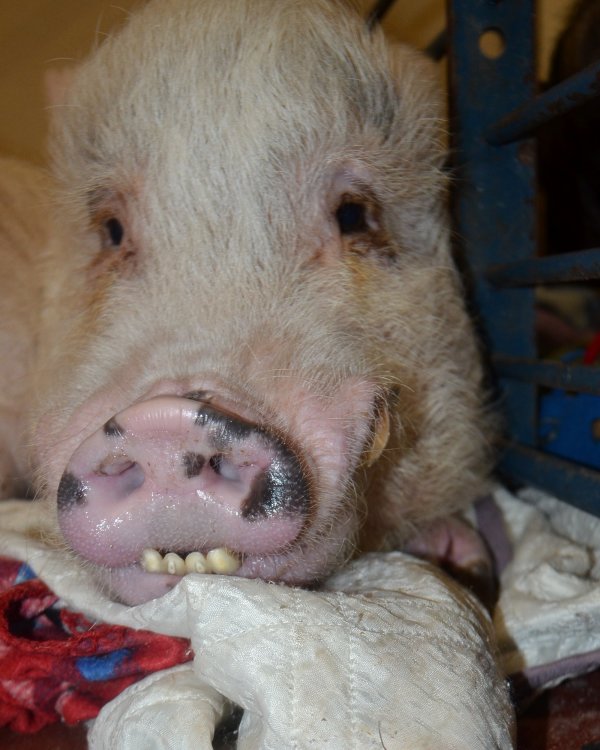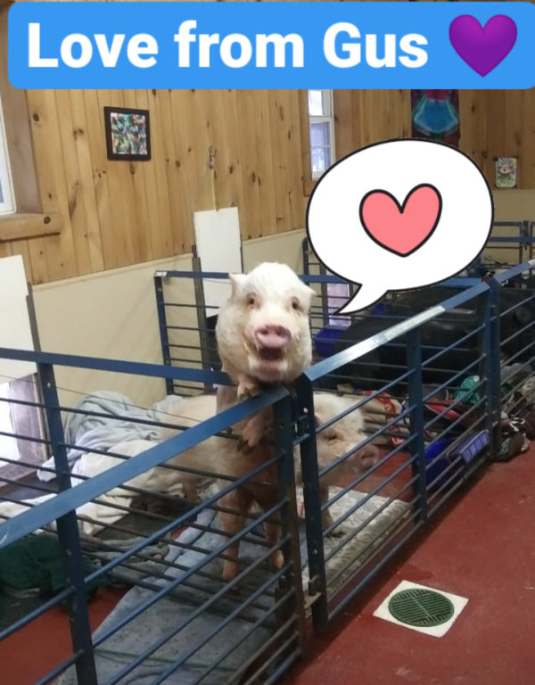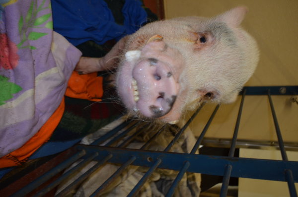 Gus was attacked by dogs that used to live with him. Due to this, it would be best for Gus to go to a home without dogs. He is up to date on all his vet work and is neutered. He comes to his name and listens well. Gus gets bathed every other month, due to a common fungal infection some pink pigs can get. He loves his baths and is a great pig.