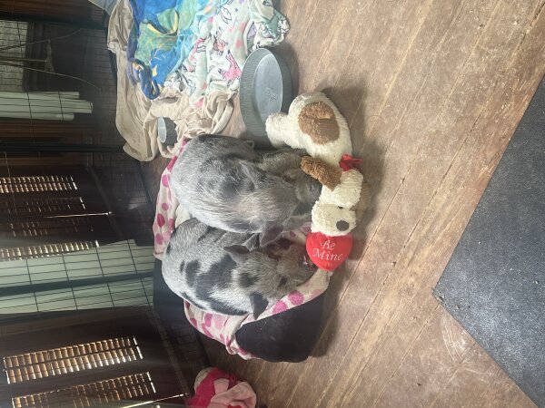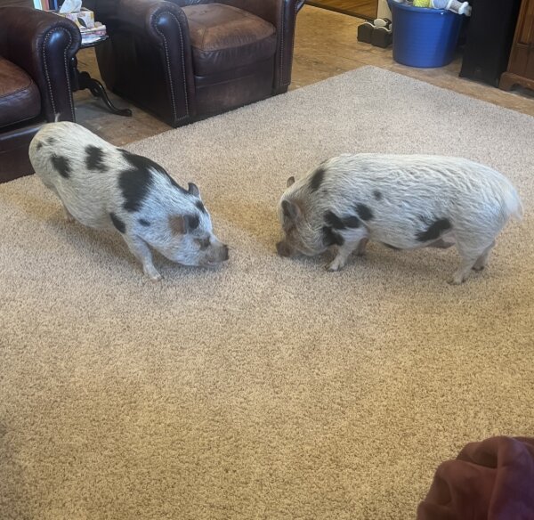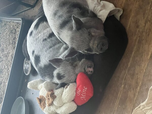 9/15/25 Still available! Liam and Isabella (Issie) are two gorgeous house piggies in need of a new home where they'll get some outside/yard time. They are bonded and must be adopted together. They were born 6/7/2019 and are both altered. They grew up as indoor pigs near a child and with an indoor cat and did well with both. They are crate trained and housebroken with a litterbox. Both can sit for treats. They are on the petite side for mini pigs.