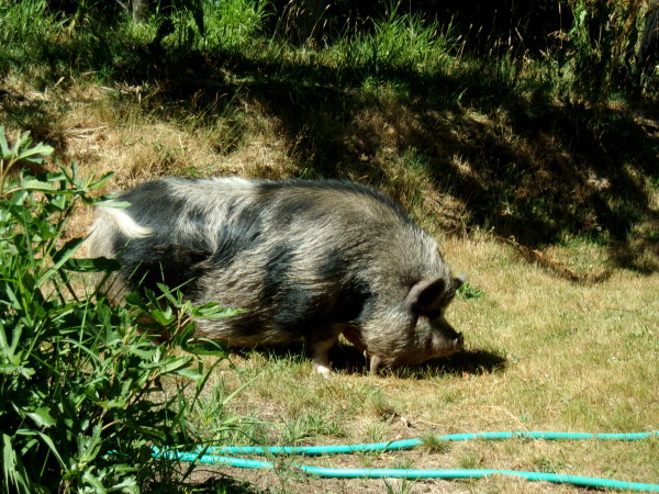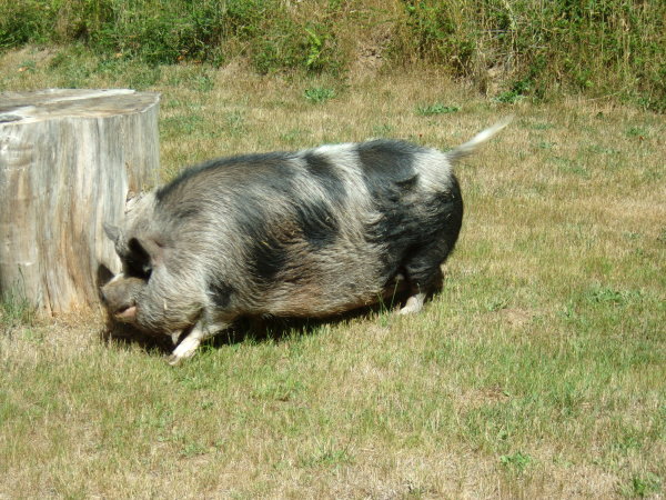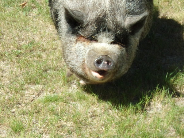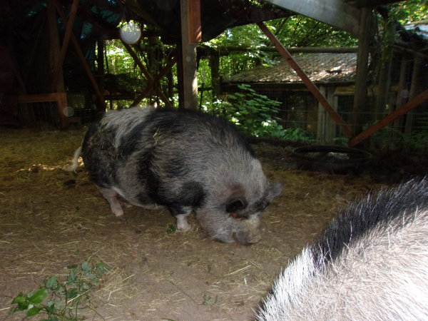 Lucy & Emma are both friendly and enjoy being pet. They don't have any experience around kids, but they interact freely with dogs who have been trained to leave pigs alone. (Dogs and pigs should always be supervised and never left alone when together.) They are fine with the cat and chickens, too. They are very clean, and take their beauty sleep very seriously. They don't even want to get up if you feed them too early. They've been dieted and have lost quite a bit of weight already, but the new family will need to keep them on their diet for a while longer.
