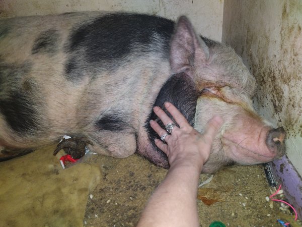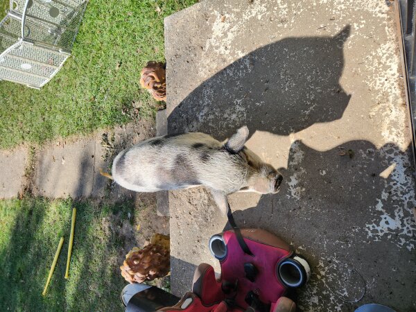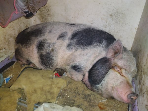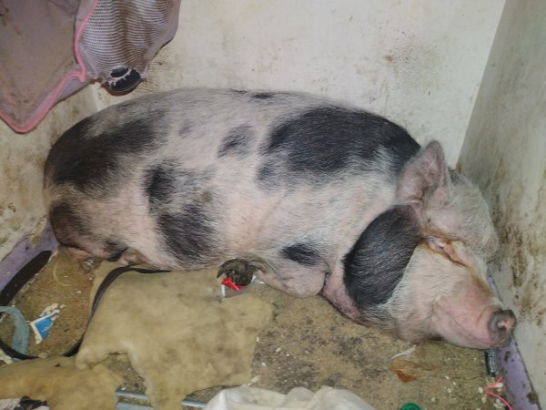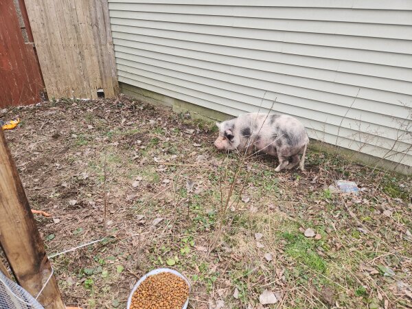 1/20/25 Still Available! Rosie Rona was saved from someone who was not feeding her. Unfortunately, the family that took her in wasn't prepared for a piggy and have been unable to get her hooves trimmed. They are in dire need of attention. The dad in the family used to be able to carry her outside, but he broke his knee and can't carry her outside and she won't use the stairs herself. She needs easy outside access and has been going to the bathroom inside since she no longer has yard access.