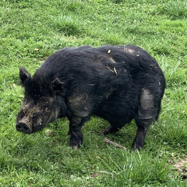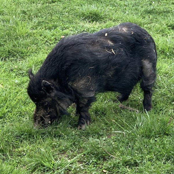 Slim is a 9 year old neutered male pot belly pig. He is a little shy but friendly. Slim enjoys watermelon and strawberries. He is up to date on his vaccines, hoof, and tusk trims. Slim has issues with arthritis due to being malnourished in his previous home and has some mobility issues. He is currently on an anti-inflammatory pain med to help him get around better. Slim is an outdoor pig and has never been in a house.