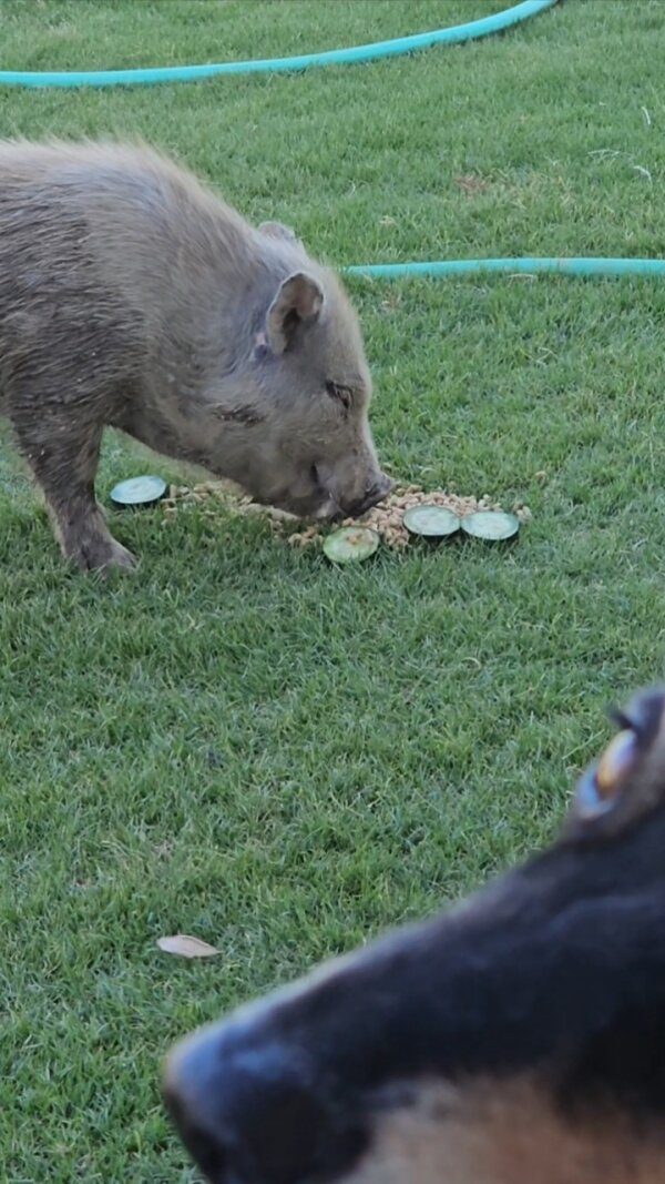Meet Snorkel! This cutie was found roaming a week ago, and the family who has been feeding him just found out he was dumped by his old family when they moved. The people who found & corralled him cannot keep him; they just didn't want him to get hit by a car. He's young and seems like a smart guy. He is skittish when the family tries to pet him, but he doesn't run from them and he follows them around. He's been great with the family's dogs so far and seems to really enjoy the company. (Dogs and pigs should always be supervised and never left alone when together.)