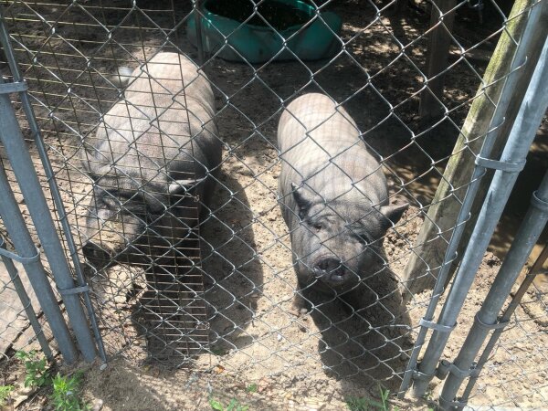 Wilbur and Winn are two pigs who were dumped on the property last month. The town won't allow them to stay, and the property owner isn't set up for pigs even if they were allowed to keep them. Because they were abandoned, not much is known about their past. They both come running to gate when they see people, and are steadily becoming more friendly. Considering they used to run from people, they've made a ton of progress in less than a month!