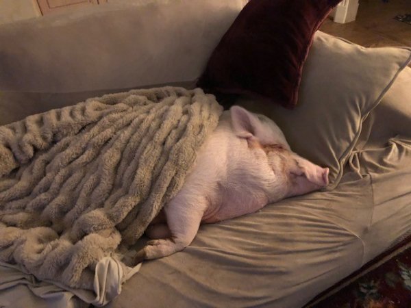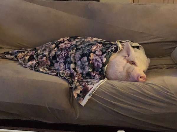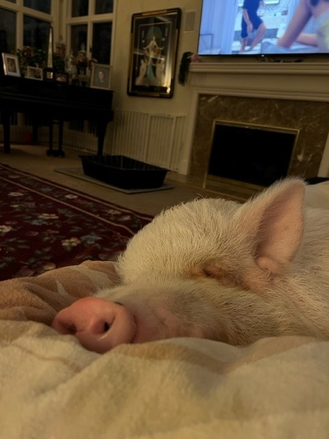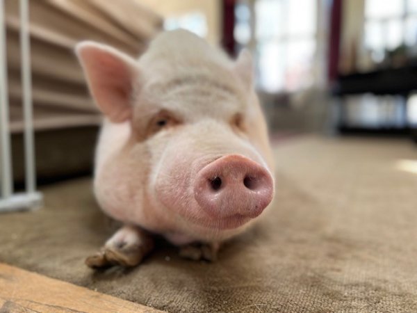 Winston has been a pretty pampered pig. He lives indoors and love to go outside when the weather is nice (above 60 or so). He's not accustomed to cold temperatures or snow. He loves cozy blankets and loves to root in the grass when weather permits. He knows "sit" and "spin". He is neutered and has been to vet in the last year, but could use a hoof trim.