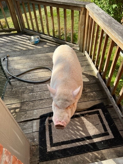 5/1/23: Winston is now boarding at Ross Mill Farm and available for adoption from there. Winston is a crate trained and housebroken inside pig who will use a litterbox (but prefers to potty outside). Winston loves belly rubs and enjoys going outdoors in the spring and summer. He likes to take naps in the sun (but have to watch for sunburn). Like all pigs, he loves to eat. He eats his regular Mazuri pig food and for treats he loves fruits and vegetables. It takes time for Winston to adjust to new people; he can be a bit nippy with strangers. He's not used to being around children or around other animals. But when he's in the yard and dogs are barking on the other side of the fence, Winston doesn't seem to flinch. He just does his own thing. (Dogs and pigs should always be supervised and never left alone when together.)