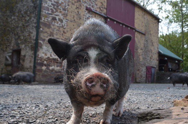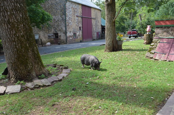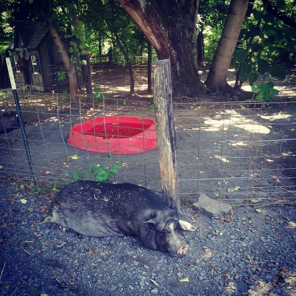 Winston lives in the barn at Ross Mill Farm. He was born in a barnyard and has been surrendered twice: once at 8 weeks old with his siblings (he's one of seven piglets we called the Giggle Gang), then adopted in July 2010, and then he was surrendered again in Jan '19. He was crate trained and an an indoor pig years ago and was good with a ramp. He was moved to outside environment in summer 2017 due to poor potty habits. Winston is chipped, fine with kids ages 3-15, ok with big & little dogs, and best buds with chickens. (Dogs and pigs should always be supervised and never left alone when together.)