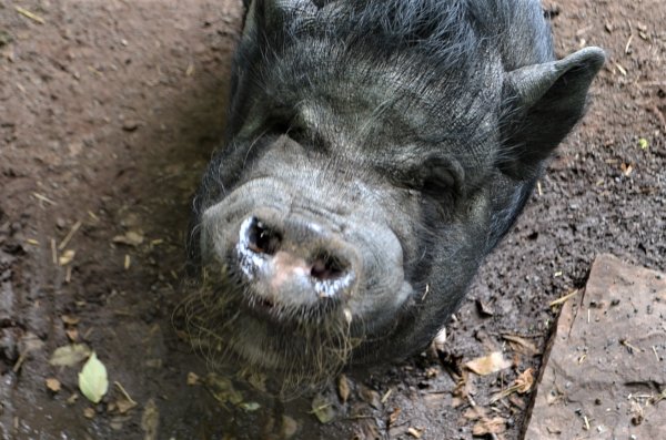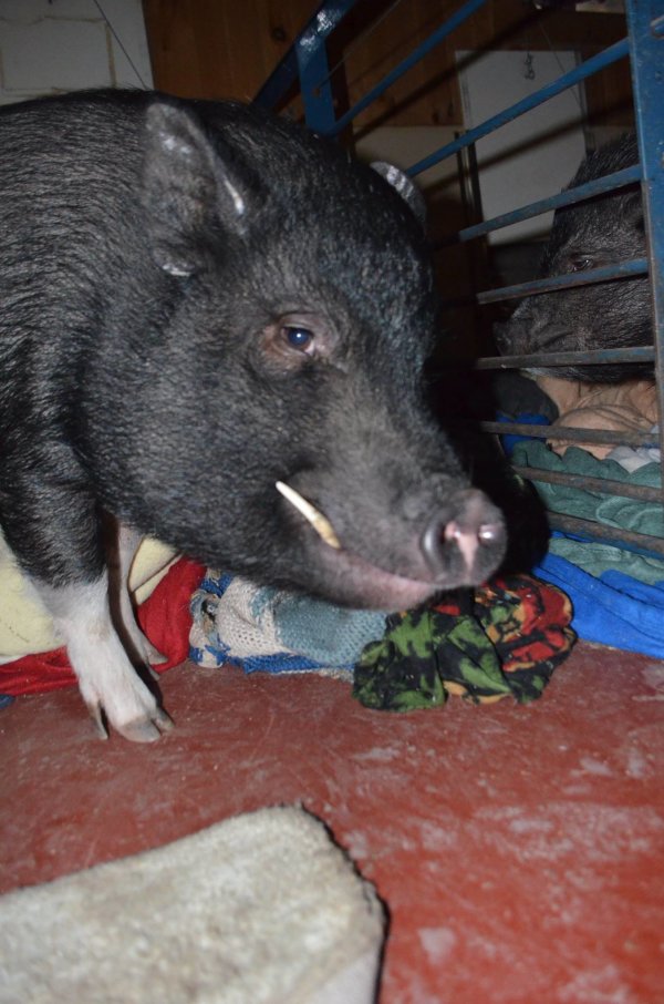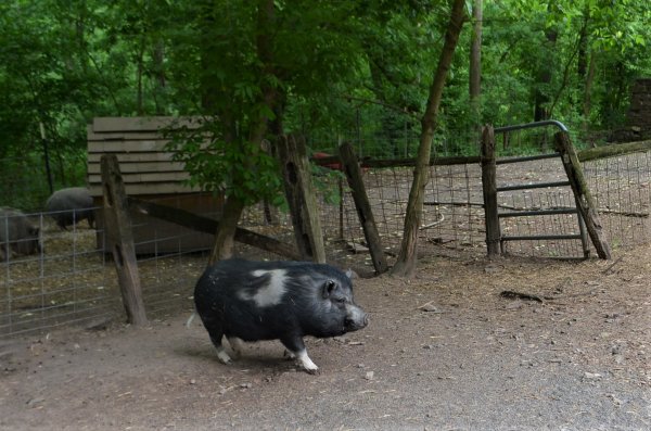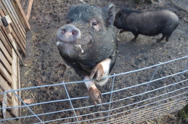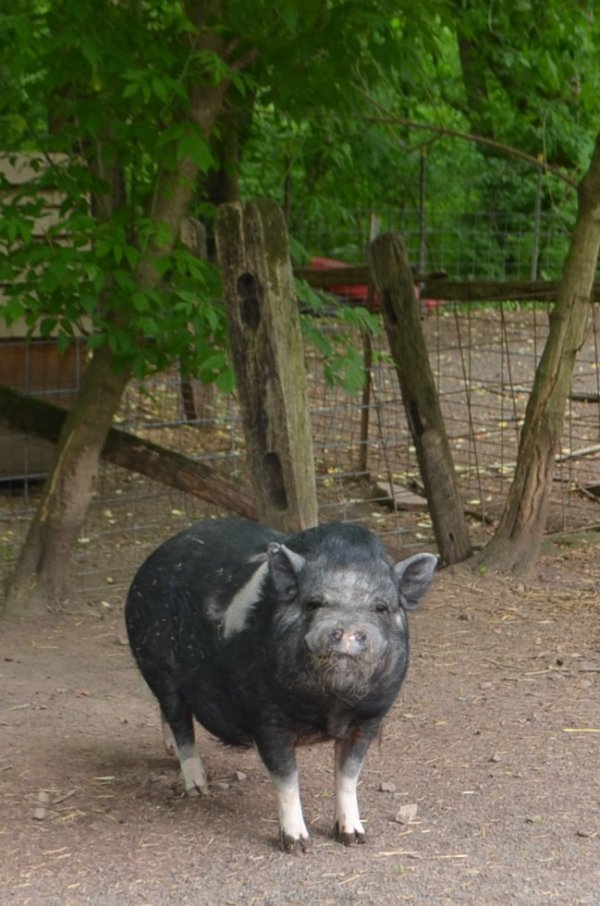 Samson (black - born 03.01.2012) came to Ross Mill Farm in the summer of 2015. Albert (black w/white socks - born 06.24.2012) arrived a year later and the two were paired up. They are kind of an odd couple, but it works for them! Albert is a friendly boy, outgoing, and loves getting all the attention. Which is fine with Samson--he tends to be wary of new situations and prefers to hang back. He takes a time to warm up in new situations but with patience and love he comes around. We would like to see these boys be placed together in an outside environment. Both Albert and Samson are medium sized pigs.
