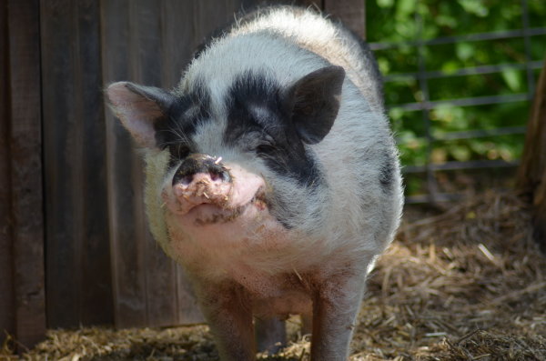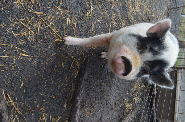 Bubba is a very handsome boy in need of an experienced piggy home. He is still slightly aggressive but appears it is mainly due to a fear of quick movements and loud noises. He was born September 21, 2010 and was neutered at 4 months. We are very hopeful his behavior will turn around with more time and affection. Bubba has been spending time with two larger black pigs naed Corina and Cynthia, which has helped him with some pig behaviors. Bubba is a medium sized pig.