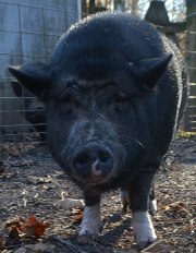 Daisy Mae (White) and Jenny (Black) are a pair of pigs who currently reside at Ross Mill Farm. After being adopted from RMF in 2011 they were returned on 09/10/2018. This was through no fault of theirs. They are a pair of spayed females. Both Daisy Mae and Jenny are friendly pigs who have many good years left. They are outdoor pigs who enjoy snuggling with each other. Both of them are getting excellent care at RMF and appear to have been well cared for throughout their lives. These 2 are used to being in a loving home. For a family who is looking to rescue a great pair of pigs these 2 could bring years of joy and companionship. Both girls are medium sized pigs.