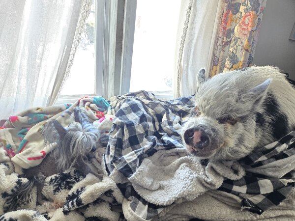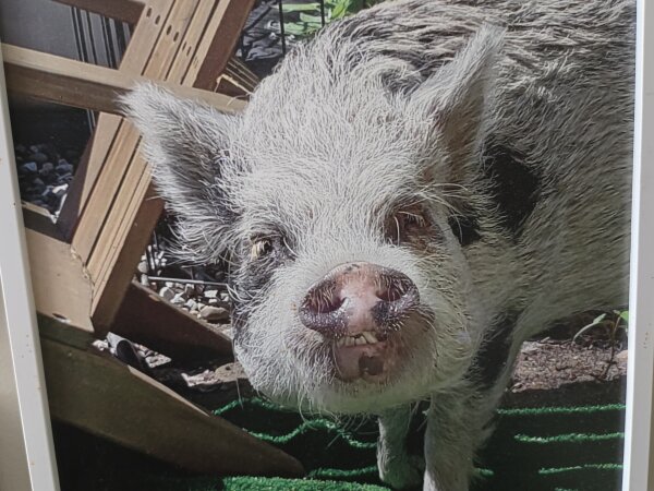 Truffles, Freckles, and Shadow are a trio of pigs in need of a new home after a nosy neighbor started complaining. All three do well with kids, as well as other animals they've met like dogs & cats. (Dogs and pigs should always be supervised and never left alone when together.) They are all inside piggies who get yard time and are housebroken, going outside to potty. They'll sit/stand for treats.