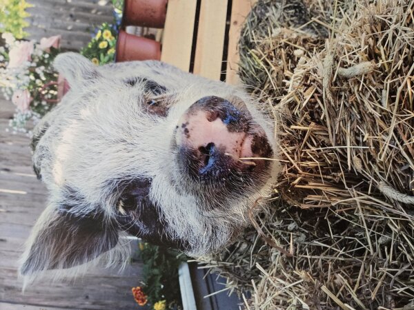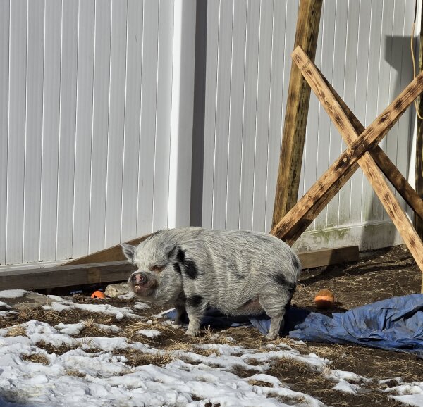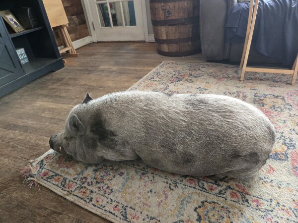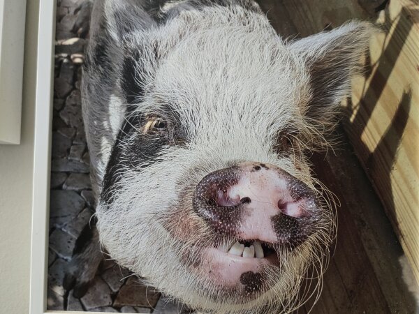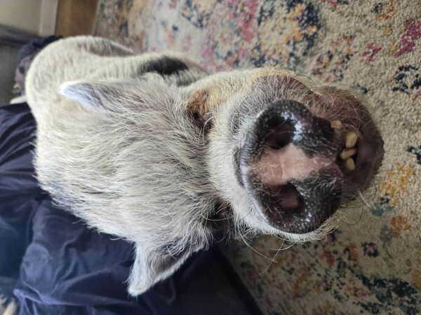 The family said: Freckles has the BEST smile! He's always smiling up at us and sinking softly. He knows his name well and comes when called. Freckles loves the yard in nice weather. He'll sleep out in the sun all day (and root in the mud). Once it gets dark he looks tp come in and get cozy in his bed. Freckles can go up and down steps and is a fairly independent piggy. He loves his family but keeps himself busy if needed. Sometimes he thinks he's a shawl and will drape himself around your back when you sit on the couch. The snugger he's in the better! He loves scratches and will fall over for belly rubs. Freckles will sit for a treat and follow a treat in a circle. Freckles needs his food watered down and ideally a prune or two a day to help things move. He's gotten constipated twice (fleet enemas work if needed and he tolerates it well).