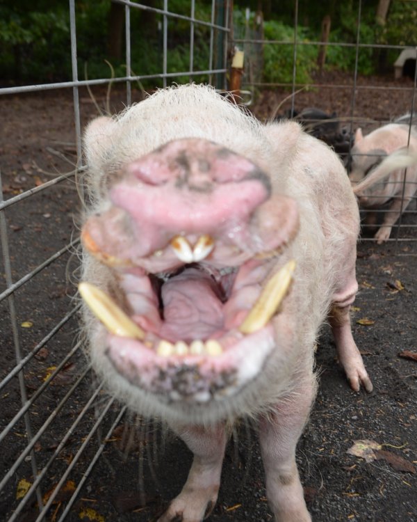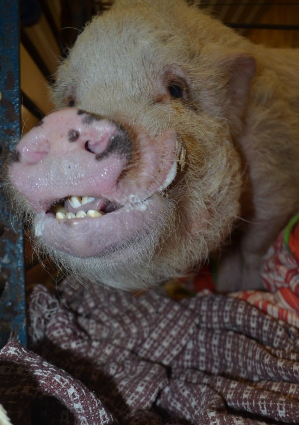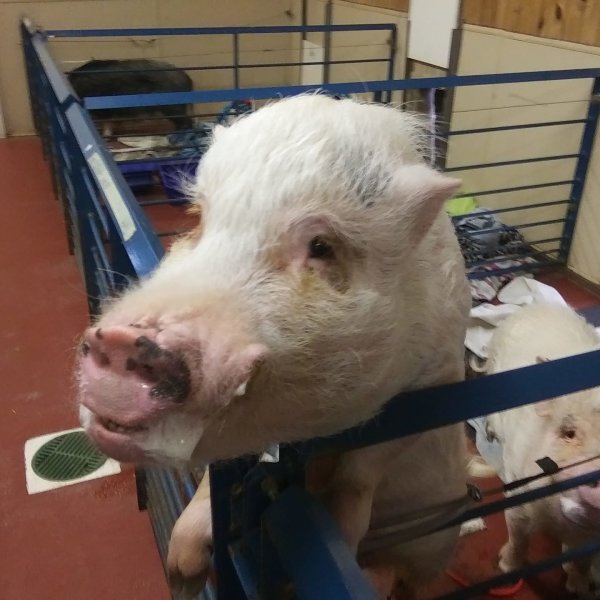 Gus was attacked by dogs that used to live with him. Due to this, it would be best for Gus to go to a home without dogs. He is up to date on all his vet work and is neutered. He comes to his name and listens well. Gus gets bathed every other month, due to a common fungal infection some pink pigs can get. He loves his baths and is a great pig.