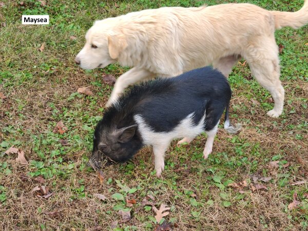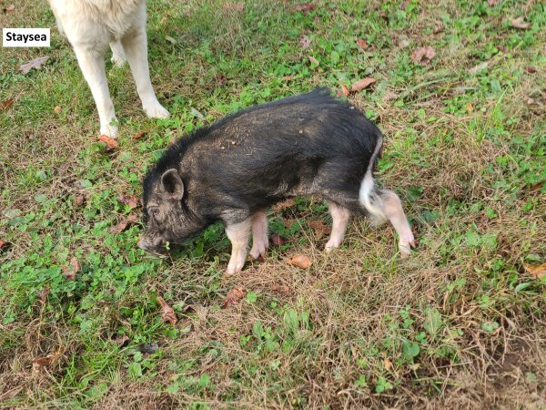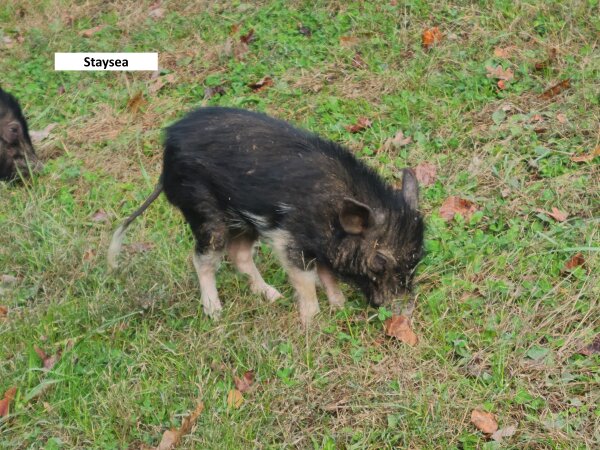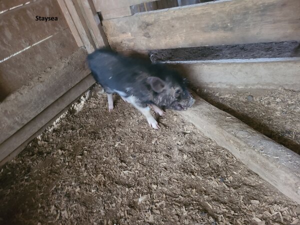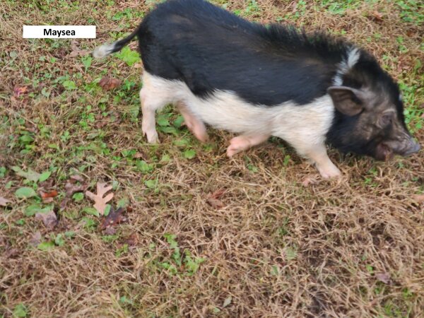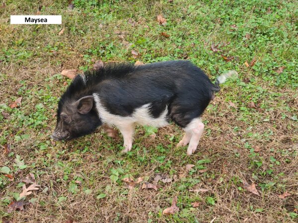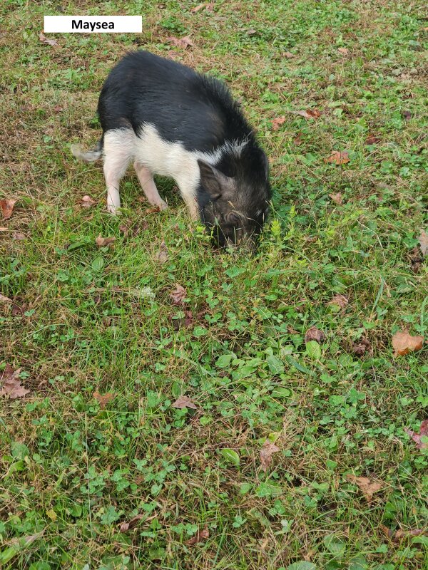 This listing is for Maysea & Staysea, who are together in a pen with Knotty & Spotty. Staysea is the underweight one and is substantially smaller than the others. The girl pigs are all a little more social & less shy than the boys, but all the pigs will warm up with more attention and care in the new homes.