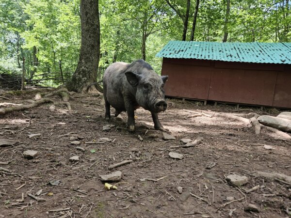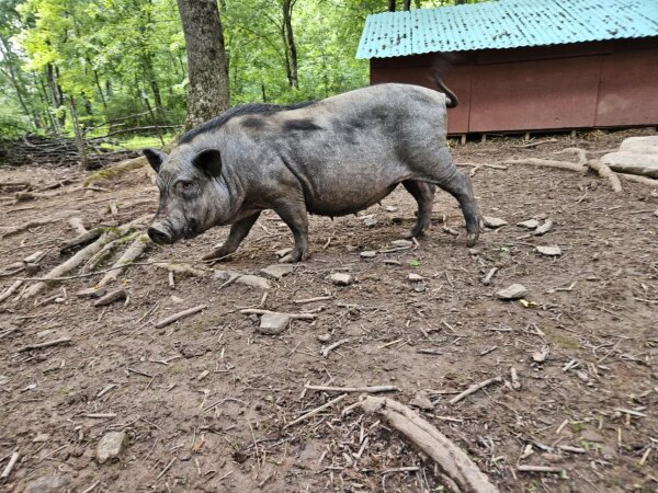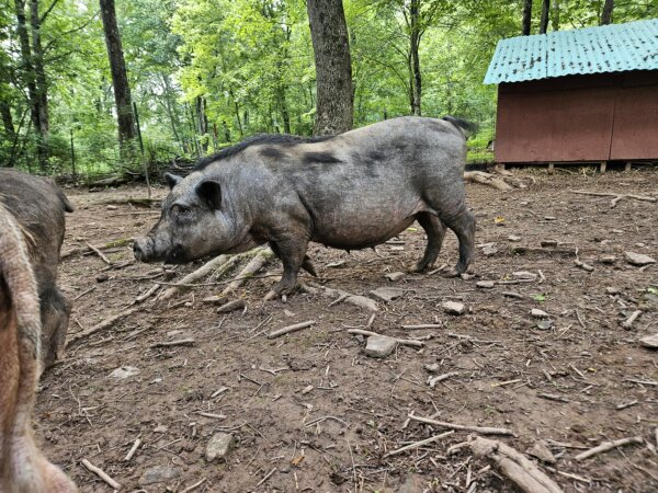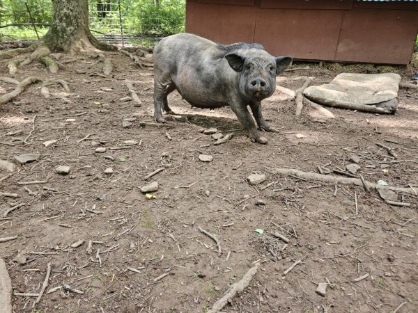 Pebbles came to Ross Mill Farm from a recent rescue after a barn caught fire. There are a few pigs from the same rescue all currently living in this pen: Peppa, Pebbles, Oopsie (all unspayed females), and Cillian (neutered male), as well as Cyrus (neutered male piglet) in the quarantine pen next door.