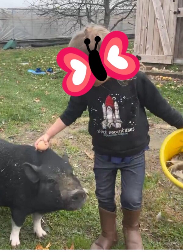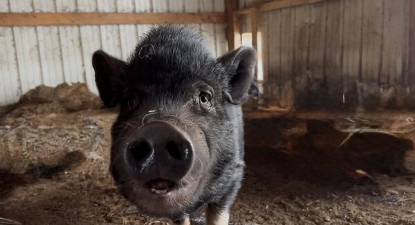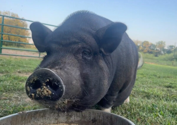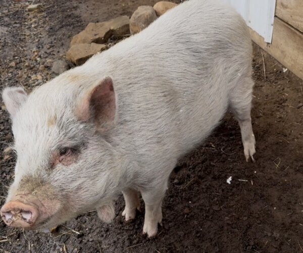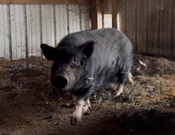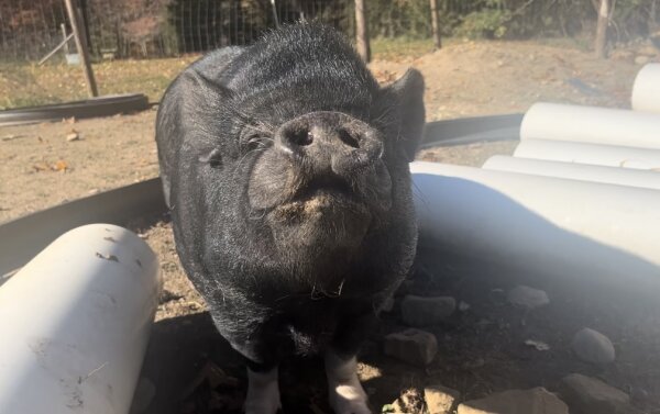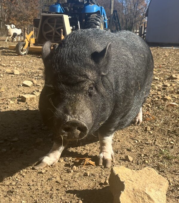 Penelope is an outside pig in need of a home with a patient family, preferably one with piggy experience and no young kids. She doesn't mind or bother cats or chickens, and has co-lived with goats, although she would probably prefer not to. She'd probably do well with another pig, as well as strong family members who can reinforce that humans are the top hogs in the family.