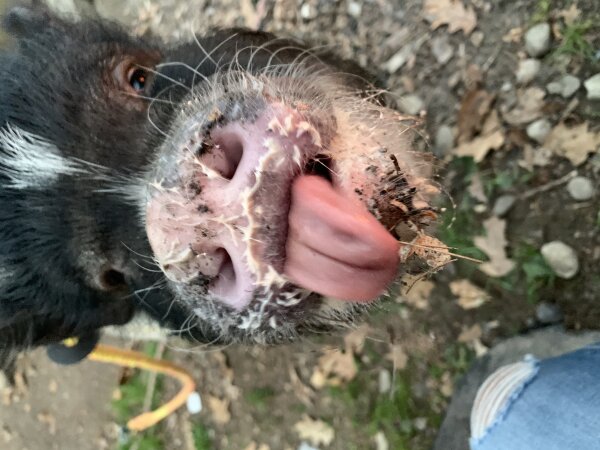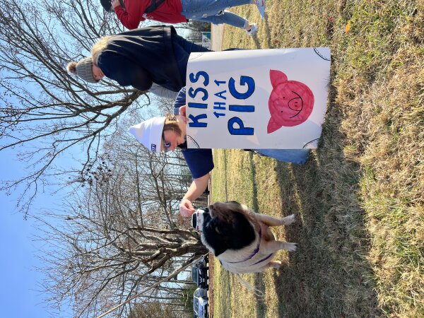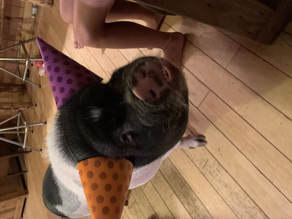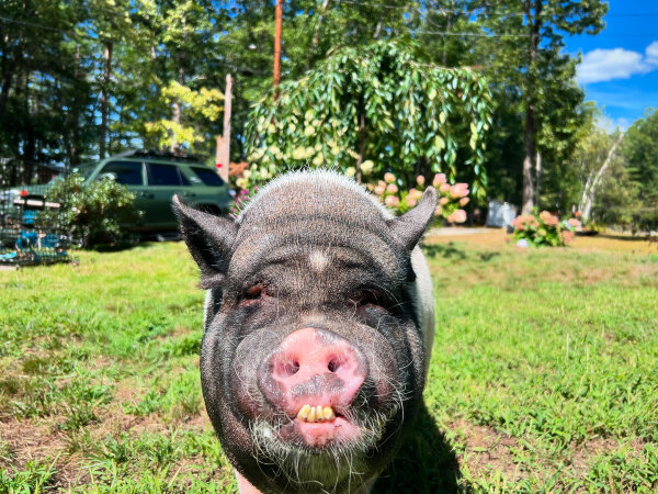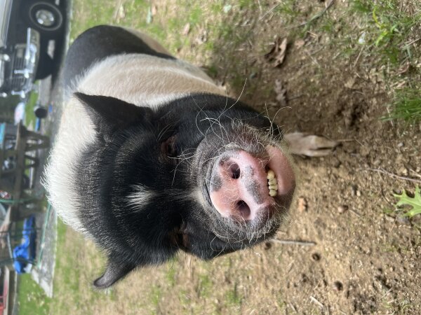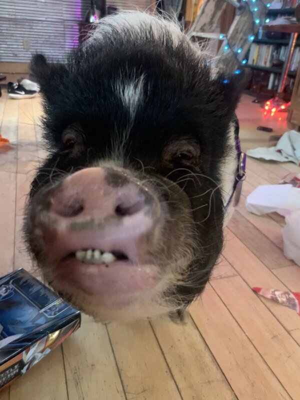Phoebe can be easily startled and tends to snap if someone quickly approaches her. That said, she has been around a lot of kids in her lifetime and done well with them. Calm kids who know how to gently approach animals should be fine. Phoebe has been around dogs her entire life and they definitely snap at each other sometimes, but most often coexist fine. (Dogs and pigs should always be supervised and never left alone when together.) She really hates the cold and enjoys being outside in the summer. She is very food motivated, but is pretty mellow otherwise & mostly lays around all day.