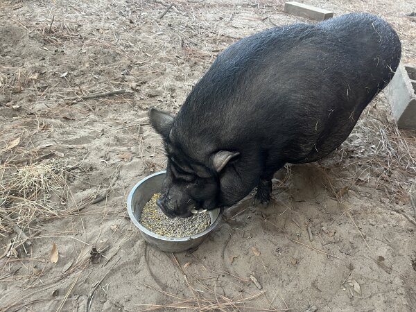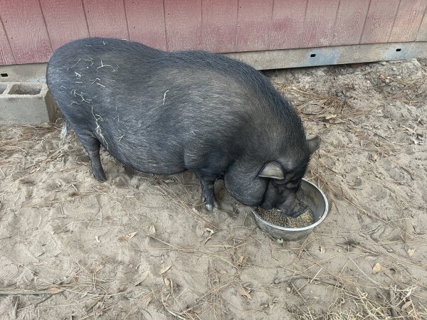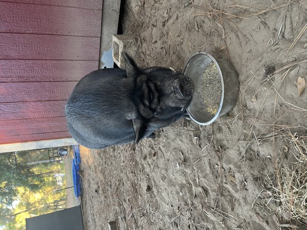 Pickles and Piggy Sue are two pigs in need of a new home where they'll receive more care & interaction. They are both good with everyone. They don't live with kids, but they've been fine around the grandchildren when they visit and there's been no issues. Pickle and Piggy Sue are free range throughout the property with all of the animals and they pretty much do their own thing without issue. (Dogs and pigs should always be supervised and never left alone when together.) They've very easy going and peaceful piggies, but they both enjoy attention, too! Piggy Sue will sit for treats.