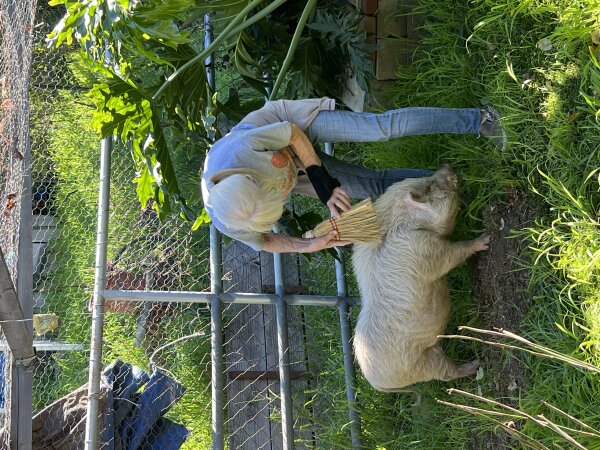 This handsome boy is a very smart pig. He was just neutered, and it takes a little bit for hormones to get out of the system, so they are looking forward to see more of his personality (and less of those hormones!) soon. Because of the recent neuter, he can't go somewhere with unaltered females until mid-May (males are still fertile potentially for a month or two post-neuter).