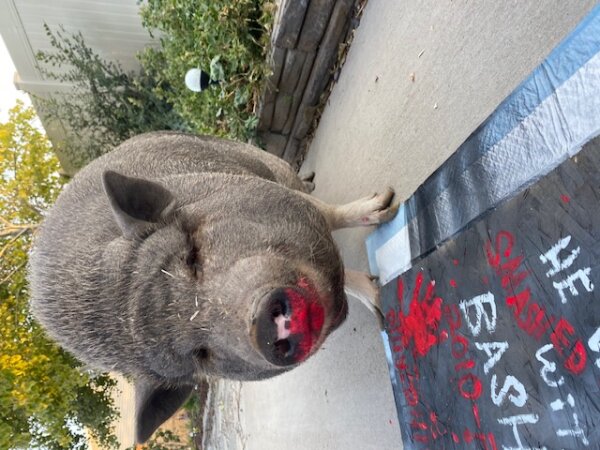 Meet Pig Pig! She's a lovely spayed outside piggy in need of a new home. She's sweet and loving and she is very vocal. Pig Pig is a girl's girl - she prefers women and doesn't really care for men. She's good with kids of all ages, as well as other animals like dogs & cats. (Dogs and pigs should always be supervised and never left alone when together.) She knows her name, and used to sit for treats (but doesn't really anymore). She is currently on a diet and eats senior horse feed, per her vet, to keep her weight manageable. She can't see very well.