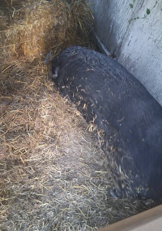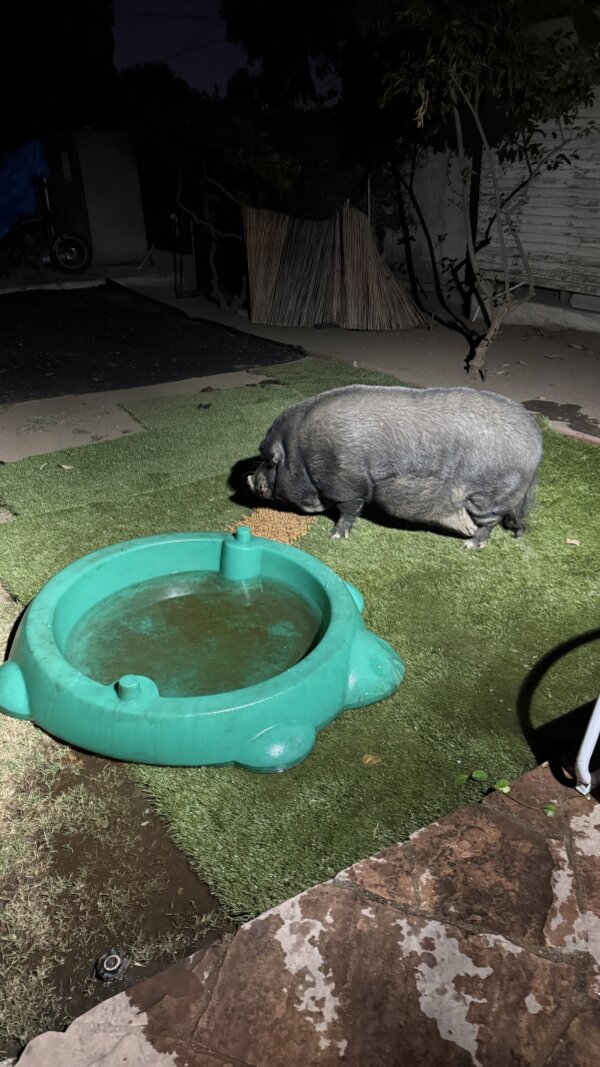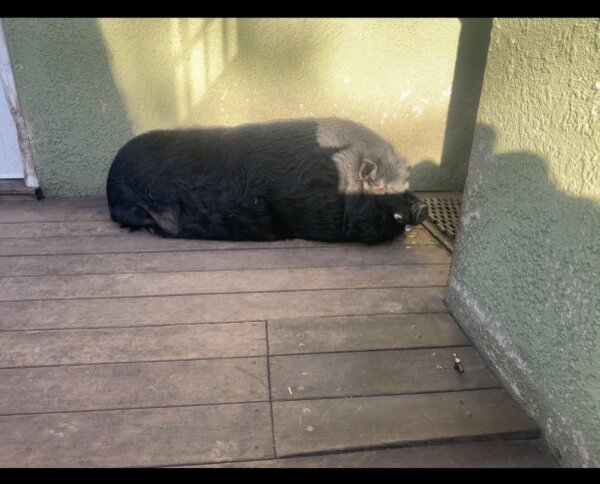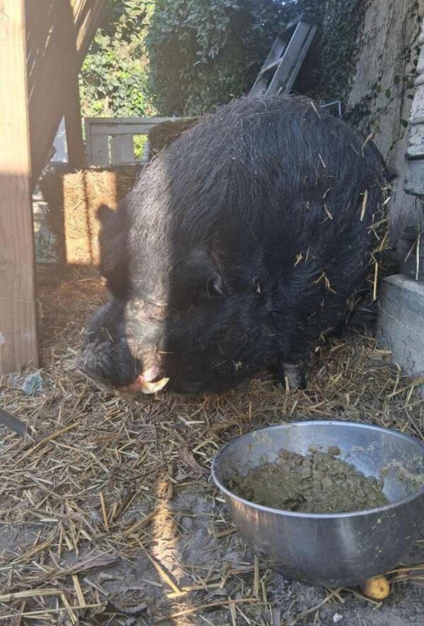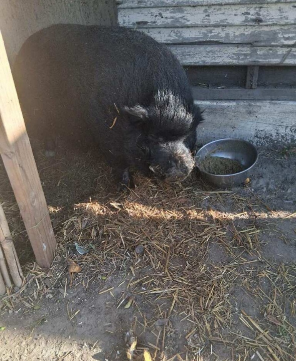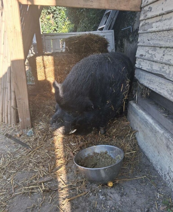 Poor Pig Pig has been living in abandoned home since 8/2025, after his owner passed away. A few generous neighbors have been feeding him ever since then. The family member inheriting the home isn't interested in keeping him once the estate is finalized, so the neighbor who has been feeding him is helping find him a new home (with permission). If a home isn't found, the family member said they planned to have him euthanized.