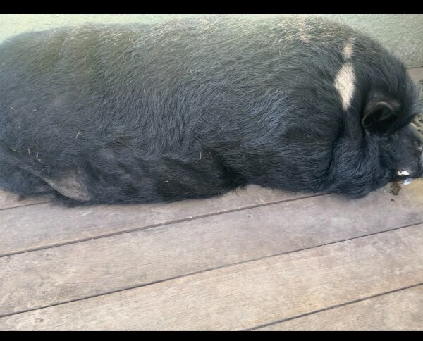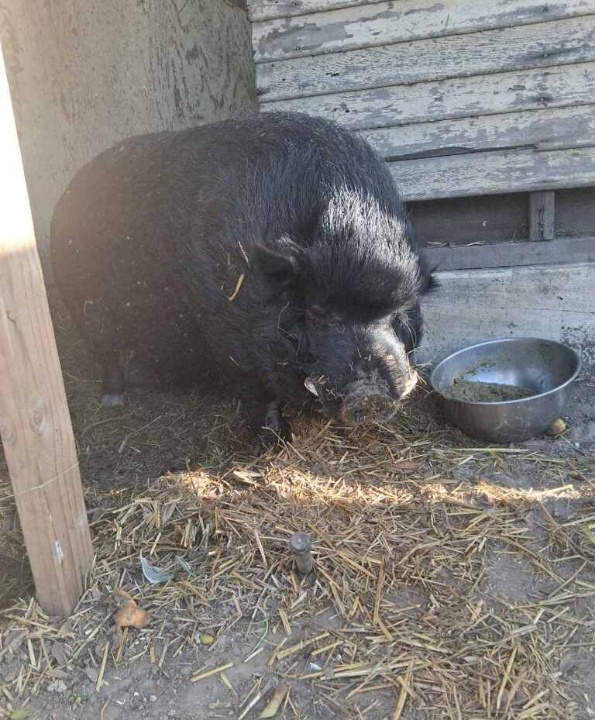 Pig Pig is the sweetest boy, super affectionate and seems to get along with anyone and everyone. He's done well with kids of all ages. He lives alongside two dogs (also being rehomed) and is good with them. (Dogs and pigs should always be supervised and never left alone when together.) Pig Pig lives outside, but also came inside when his owner was alive. He isn't neutered, so he would mount a chair on occasion.