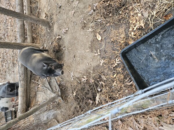 Tilly and Truffles are the parents of Pig Pig, who was the only survivor out of an accidental litter in 2023 before Truffles was neutered. (Pig Pig is also neutered.) They all live outside in their own pens. None of the group have issues with the cats and dogs on the property, but the pigs do have their own fenced areas. (Dogs and pigs should always be supervised and never left alone when together.)