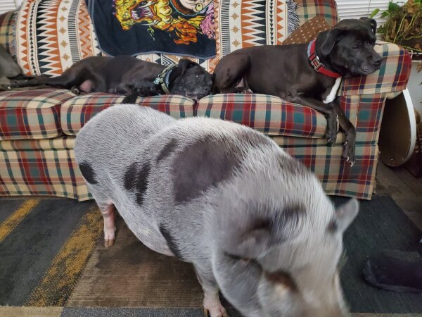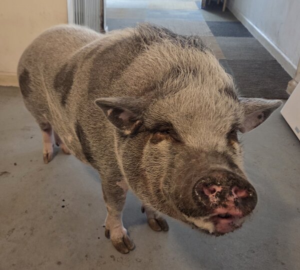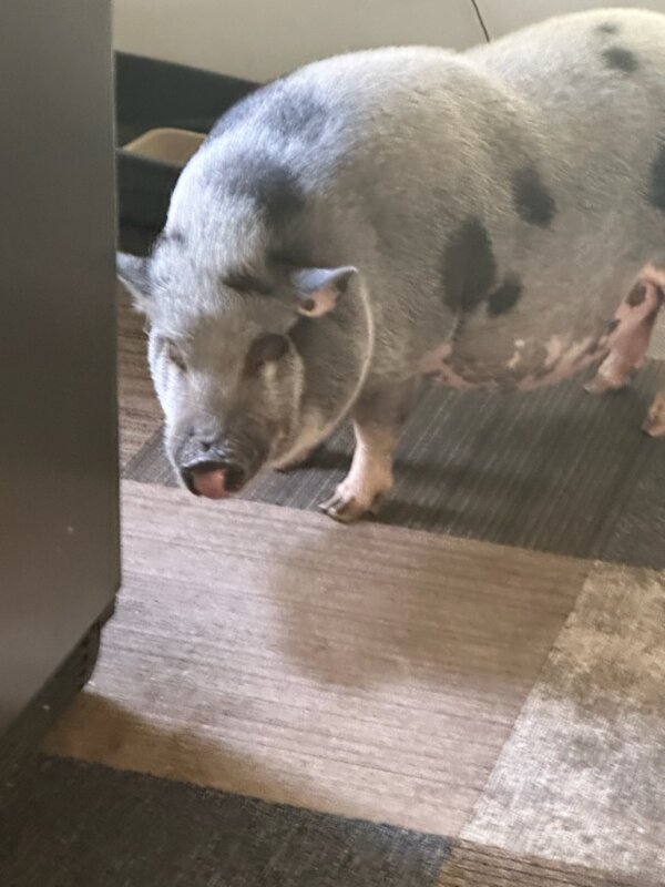 10/27/25 Still available & in need of a home! New profile photo added! Pig Pig is a gorgeous young spayed female pig in need of a home. She lives inside and enjoys yard time and will go outside to potty. She loves treats! Pig Pig is not a real loving pig, and has never been around children, so a child-free home is probably best for her. She does well with the dogs in the home. (Dogs and pigs should always be supervised and never left alone when together.)