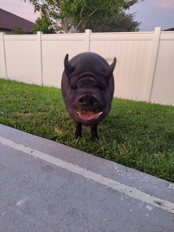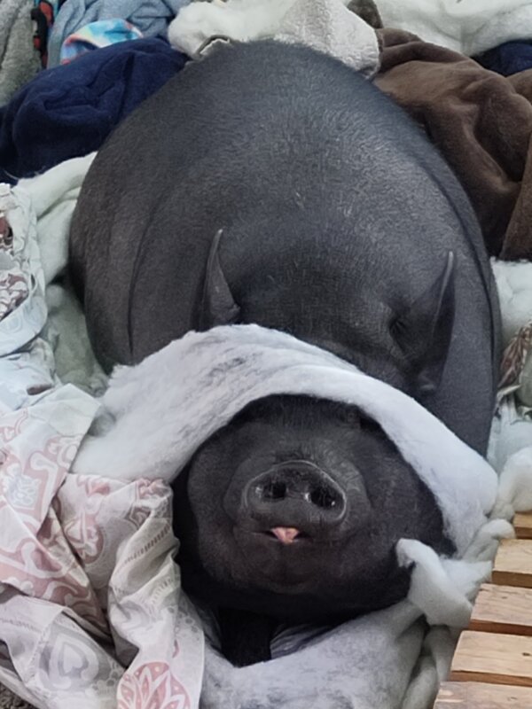 Piggles is a housebroken and crate trained indoor piggy who loves his outside time. He's neutered, current on routine vet care, up to date on shots, but could use a hoof/tusk trim. This mellow boy mostly keeps to himself. He really loves his mom and dad and is tolerant of children. He communicates when he wants something and likes his own space and mutiple blanket to sleep with.