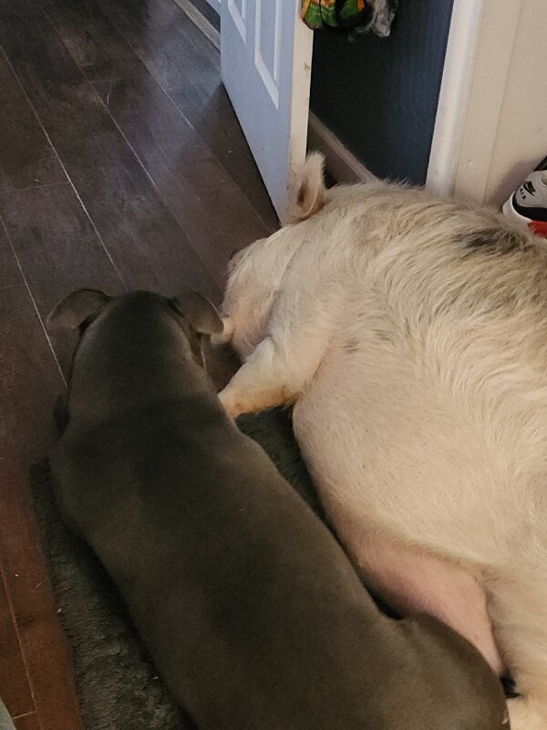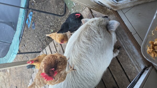 Meet Popcorn! This lovely boy is being rehomed due to an allergy issue. He is very easy going. He's amazing with kids, and the pitbull in the home is his best bud. (Dogs and pigs should always be supervised and never left alone when together.) He's housebroken, harness trained, neutered, and has been to vet in the last year. He does need a hoof trim. He sits for treats.