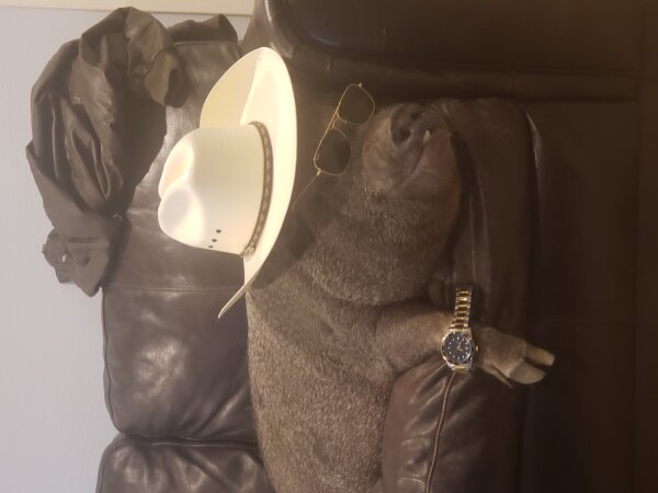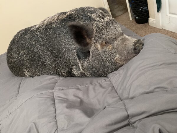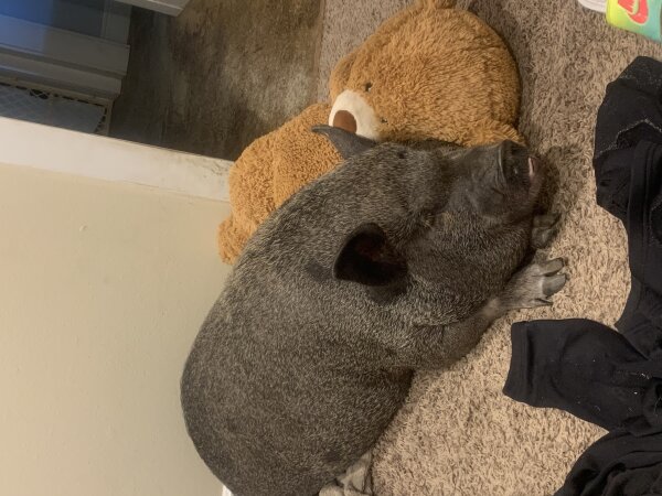 10/3/25: Still available! Introducing Pumbaa! This cutie is in need of a new home due to some unfortunate housing changes. He is a house pig, but also has shelter outside where he chooses to stay. He is housebroken, crate trained, litterbox trained (although he prefers to just go outside), and even harness trained. Pumbaa does well with the 2 y/o child in the home, in addition to loving cats. He's not as much a fan of dogs, though. (Dogs and pigs should always be supervised and never left alone when together. A dog free home might be best.) Pumbaa is a big cuddle buddy who loves laying in bed with his family and getting belly rubs. The cats ride around on his back and he likes to dress up.