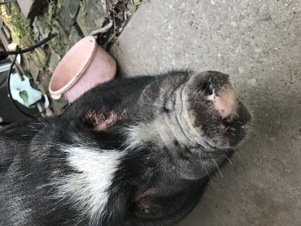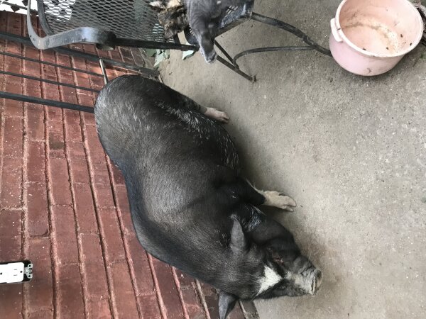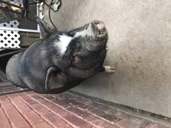 9/25/25: Still available! Rosie is a wonderful pig and a great pet! She always has her tail wagging and loves a good belly rub! She needs a good home that can afford to give her a better quality of life she deserves. She is in need of vet care for eyelashes that grow inward and irritate the eye (entropion), but her family is unable to afford this.