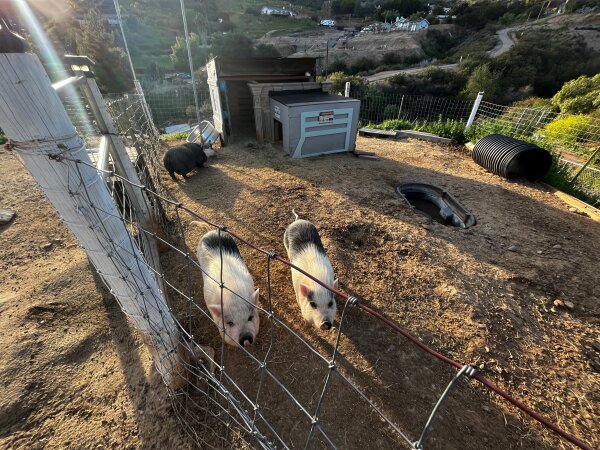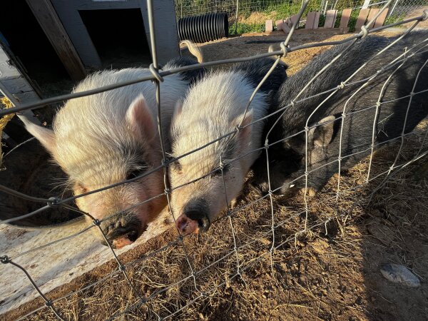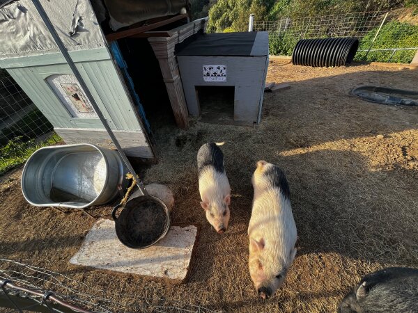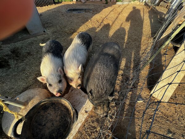 (The black pig is Kodak and he's also available separately. He can be aggressive to some men. He is not neutered and not bonded with the two girls.)