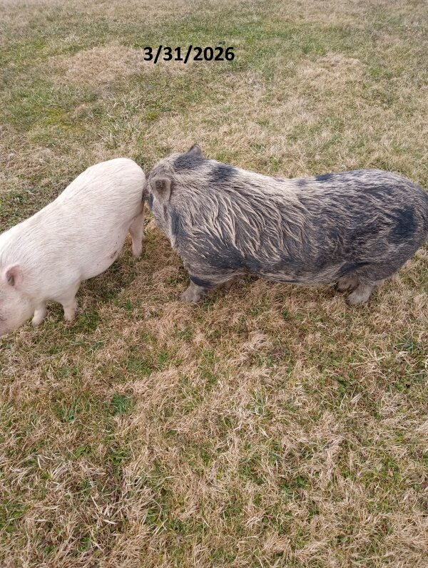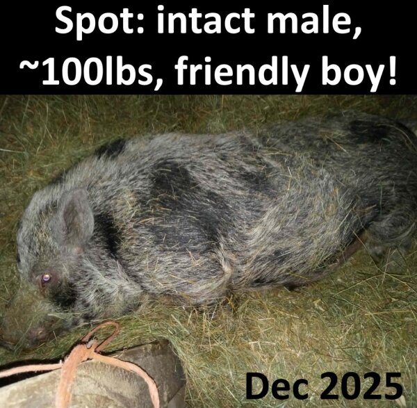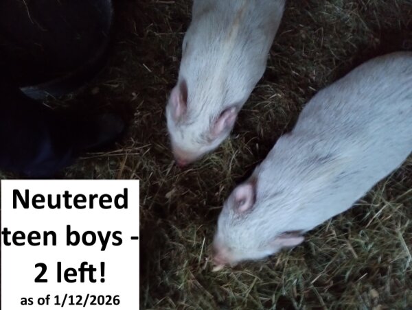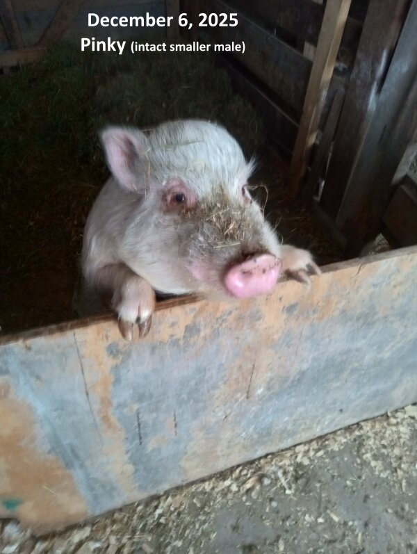 3/31/26: two unaltered males (Spot & Pinky) & two altered young boys are the last pigs in need of homes here. Three new photos just added.