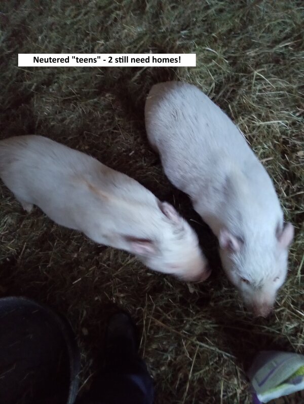 12/11/25: Two male piglets, a female piglet, and 2 teens are pending. Two neutered male piglets are still in need of homes, along with their momma (needs to be spayed), 2 boars (Pinky & Spot, estimated at 1 or 2 years old, need to be neutered), and 2 neutered "teens" (now estimated to be ~6 months old).