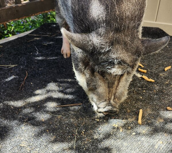Steve is in need of a home to retire to since his human is moving and unable to bring him. He is getting older and starting to become grumpy. He's usually sweet, but he has his moments. He doesn't really like little kids, but he loves other animals. (Dogs and pigs should always be supervised and never left alone when together.) He lives outside with a small shelter in his pen. He used to live inside and was crate trained and housebroken. He became an outside pig after moving to a new home a few years ago with steps & slippery floors that he had issues navigating.