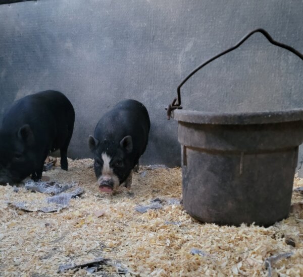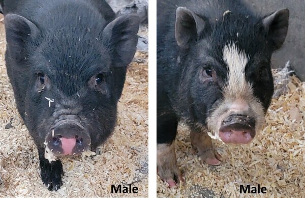 These cuties are curious and getting more trusting of human contact. They'll make wonderful additions to a family! They are comfortable with dogs, cats, chickens, and horses. (Dogs and pigs should always be supervised and never left alone when together.) They are available together or separately. You can read up on Bringing Home a New Pig and Piglet Behavior and Care, and PPN is happy to walk the adopters through any questions they have.