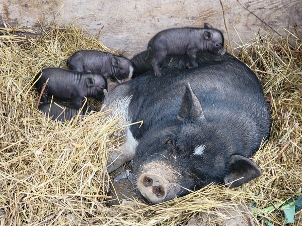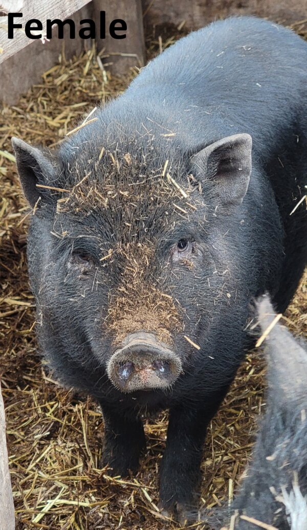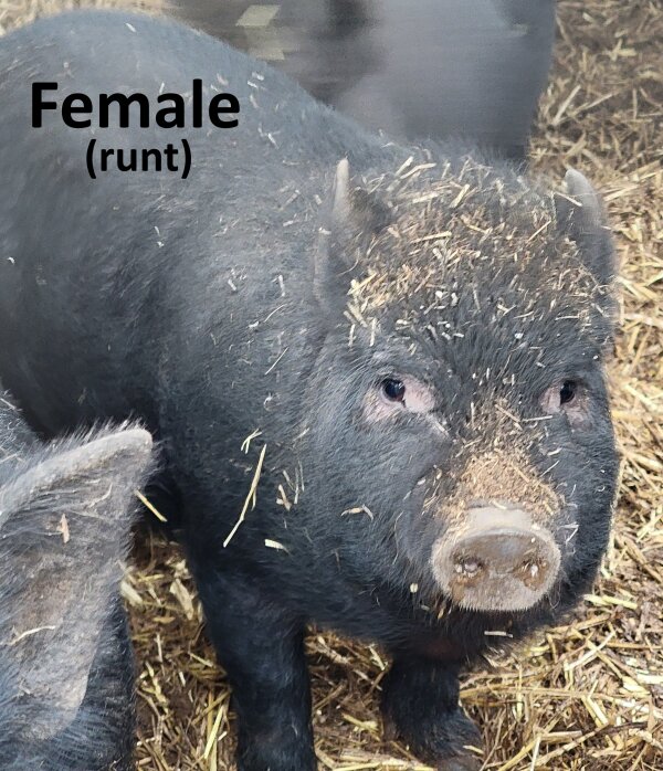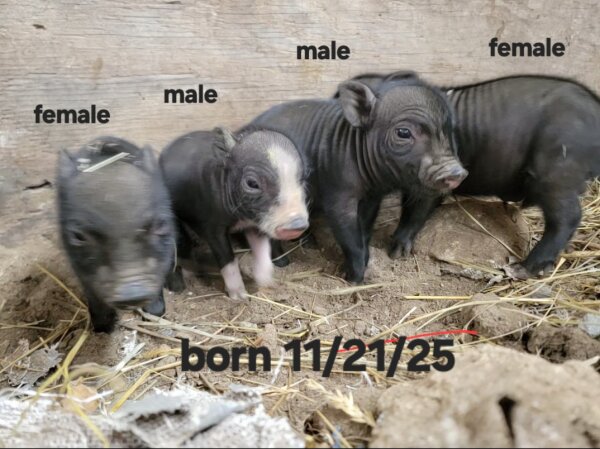 Mom's pregnancy was a surprise, and her four babies are in need of new homes. The 2 boys have been separated from their 2 sisters and mother. They were born 11/21/25. The all black one is the runt, and she is about 2" shorter than her siblings. Spay/neuters are set for 4/6/26. There will be an adoption fee for altered piglets. (More photos on Facebook post here.)