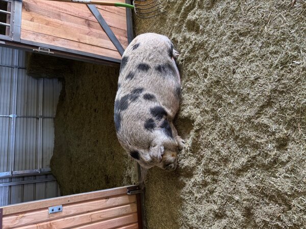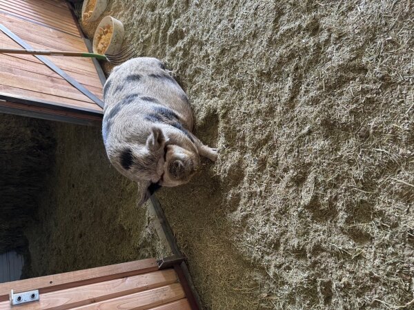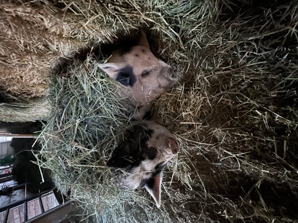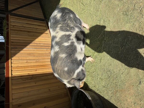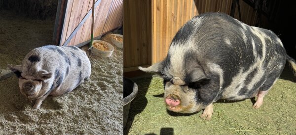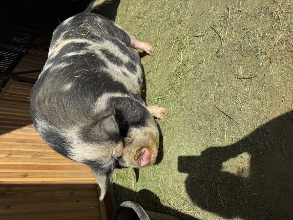 3/26/2026: Still available! New photos added! Thelma and Louise are a gorgeous pair of outdoor pigs in need of a new home due to an upcoming move. They are bonded and need to be adopted together. They love to play in mud puddles and are very social. They have free roam on the farm and come to the front door for treats. Thelma and Louise are great with people of all ages and with other animals. (Dogs and pigs should always be supervised and never left alone when together.) They are kune kunes, which are known for their lovely dispositions!