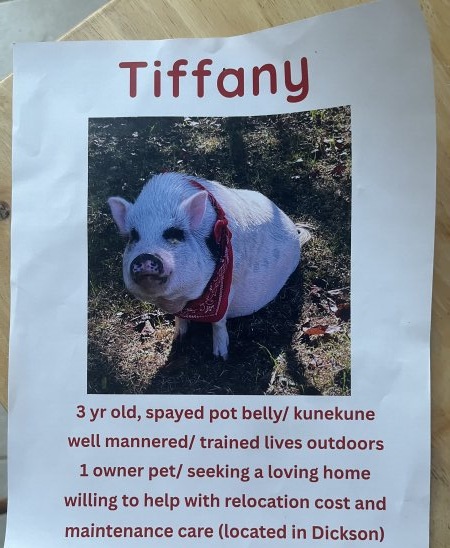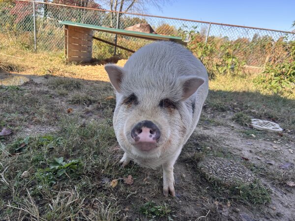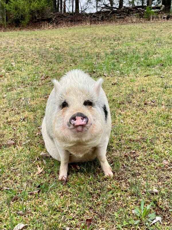 Sweet Tiffany is in need of a new home, as the property she lives on is being sold. She roams freely on 3.9 acres, has an enclosed pen, and use of the garage. She never goes very far at all. She naps a lot and looks forward to her breakfast and dinner. She is very low maintenance, enjoys walks on the property and follows along with you. She enjoys playing in water and sniffing out treats. Tiffany has had some interaction with kids, but her human thinks supervision with children would be best.