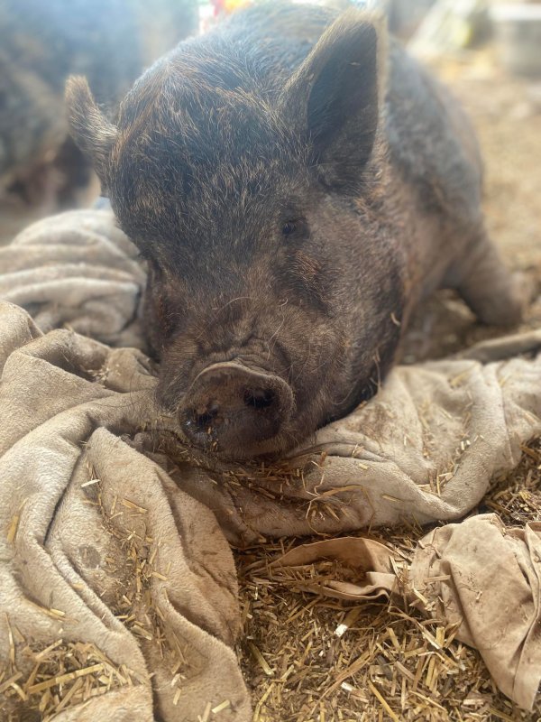 What we do know is that since being in our care he is a very nice pig who loves livin' the pig life. He is neutered, microchipped, dewormed, and vaccinated.