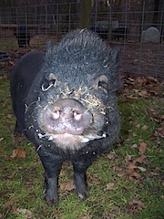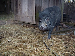 Toby arrived at Ross Mill Farm on October 1 2012. He was found as a stray in Glen Mills. He let himself into their pigs pen and made himself at home. After arriving at the farm he was put into his own pen and one night broke into the pen next to his. It appears that he wanted company because he found himself with 7 ferals and has been there ever since. Toby seems to get along with others pigs quickly. Although we do not know much about him as he was a stray Toby is very handsome and friendly. Toby's vet work is complete and he is ready for adoption. He is a medium sized pig.