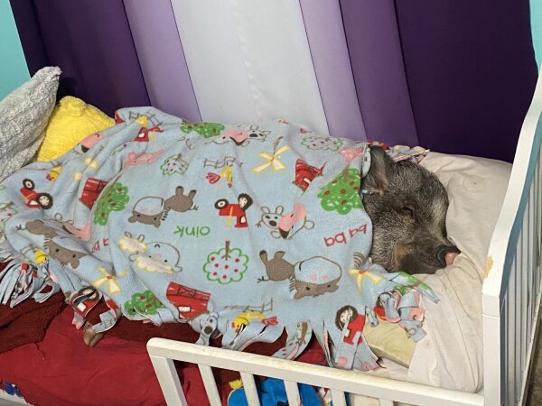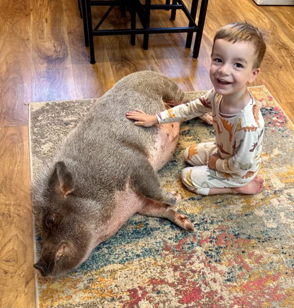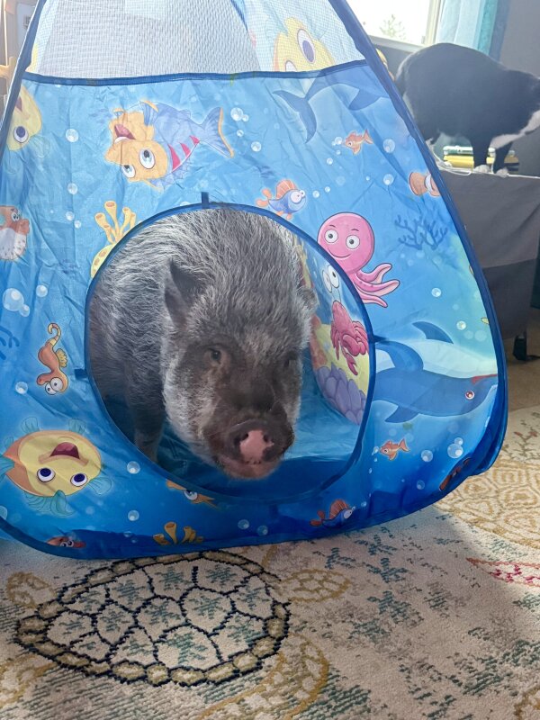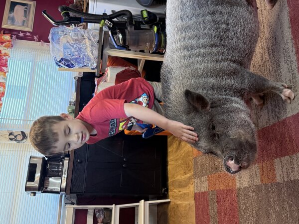 Tucker is a lovely boy in need of a new home due to an upcoming move. He's good with kids and has been around children as young as 1. He loves his belly rubbed! He has never even attempted aggressive behaviors (bite, charge, swipe) towards anyone, including strangers. He is a well behaved boy who had never touched the trash. He spins in a circle for a treat and he will ring bells on the back door when he has to go outside to go to the bathroom. Tucker is a neutered male house pig who gets yard time. He lives with a dog and 4 cats and he is fine with them all. (Dogs and pigs should always be supervised and never left alone when together.) He's crate trained and harness trained.