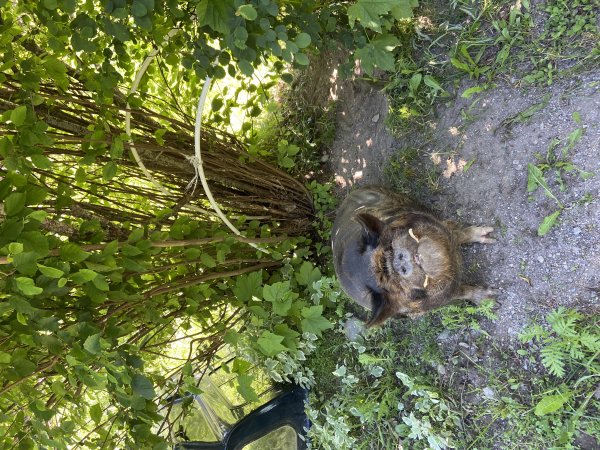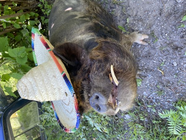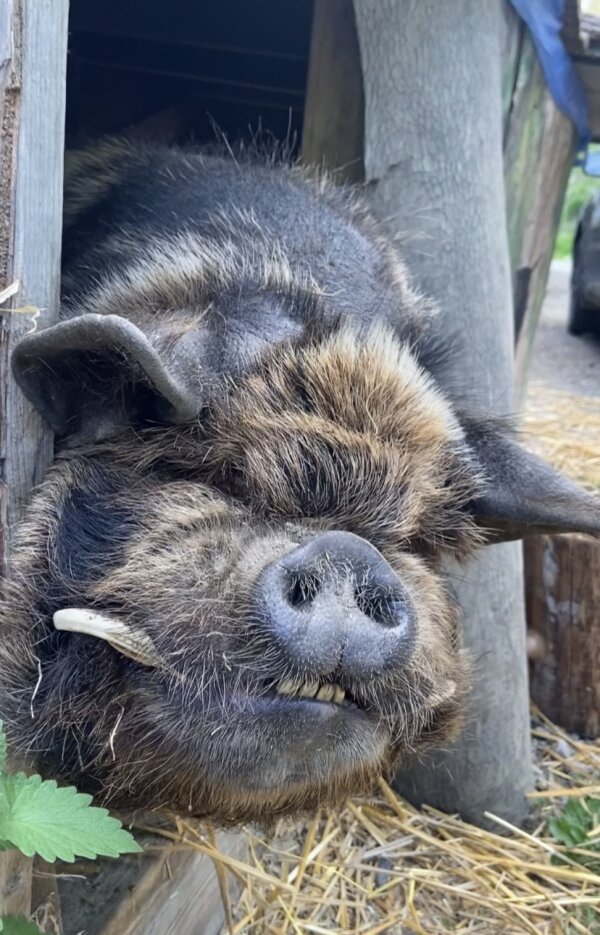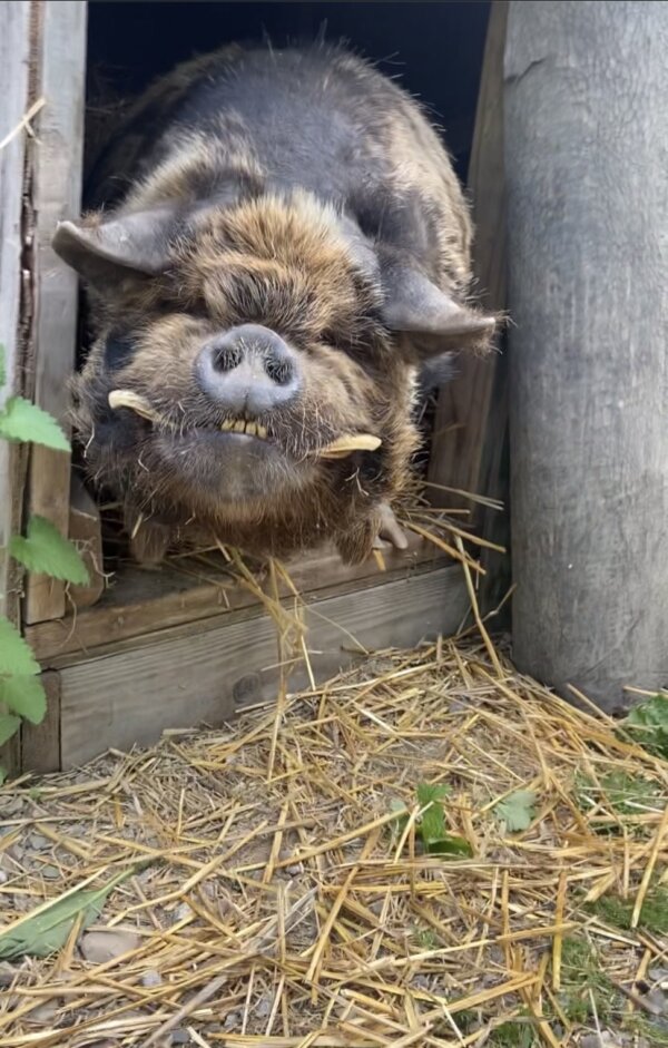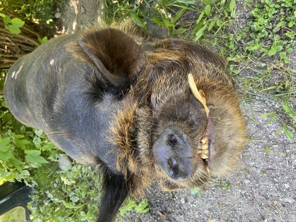 Vajor is a wonderful and super friendly neutered outside piggy who is looking for his forever home. He was purchased when he was 6 months old from a place that sells kune kune pigs, and then abandoned after 5 years. The people fostering him have been trying to find him a new home ever since. He loves belly rubs/pets/scratches and to be read too and talked to - and he will talk back to you, too! He's so sweet. He likes toys and companionship, and he knows "sit". He's fine with kids, but he's a big guy and he likes to rub up against people, so an age that can handle that is probably best. Vajor does well with other animals he has met, too. (Dogs and pigs should always be supervised and never left alone when together.)