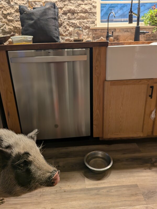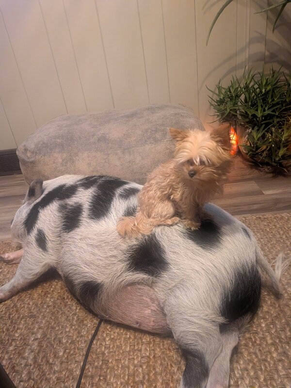 Vegan is a lovely house piggy in need of a home due to severe allergies resulting in her mom being hospitalized. (Pigs are typically considered hypoallergenic, but on rare occasions, some unlucky people do have reactions.) Vegan just wants to be near a human and rubbed all day and sleep. She's very well trained and will do anything for a treat/food. She doesn't live with any kids, but has done well with the children she's met. Vegan lives with a small dog and she loves him. (Dogs and pigs should always be supervised and never left alone when together.) She is crate trained, harness trained, and housebroken, going outside to potty. She will go lay down or go in cage for a reward.