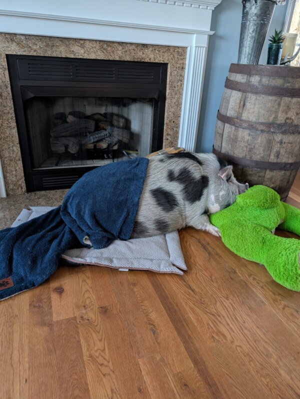 Waddles is a sweet and loving guy. He lies down for bed at 8:30pm and gets up to go out and have breakfast at 6:00am. He sleeps inside, but loves his outside time and enjoys walks in the woods. He's been great with cats, and was fine with the dog in the home before it passed. (Dogs and pigs should always be supervised and never left alone when together.)