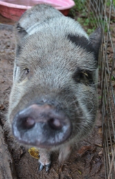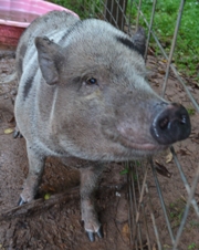 Wendell is a 6 year old spayed female. She is currently available for adoption through Ross Mill Farm. Wendell was surrendered because she was not getting along with some of the people in her home. She bonded strongly to her owner but did not have the same positive relationship with everyone. Wendell is a pig in the prime of her life. She enjoys getting scratched behind her ears and laying out on nice days. Wendell is an outdoor pig. Pigs who live outside do best in pairs. This means she could make a great partner for another outside pig. RMF offers introduction services for helping your pig to bond with Wendell. Wendell appears to be in good physical condition. All pigs at RMF are kept current on their vet work. Wendell is looking for a new home with a person she can really get close to. She does have some issues with acting out, but for the right new home she could bring years of joy and companionship.