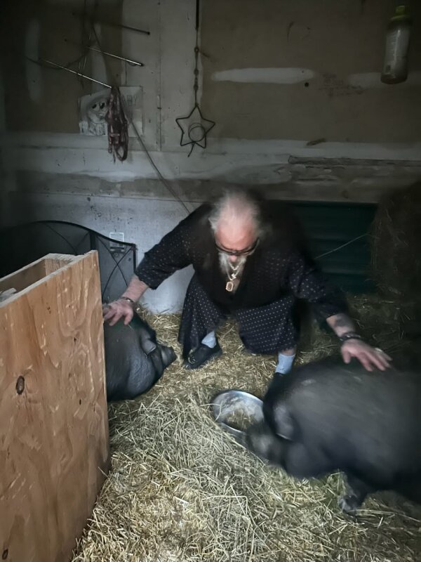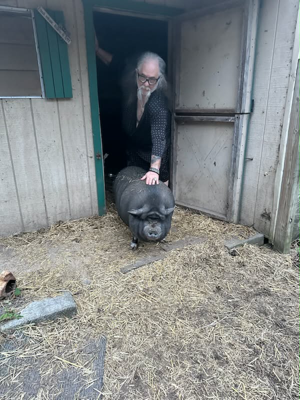 Whinnie & Luna are a pair of outdoor girls in need of a new home. The daughter moved away, and the dad is older and not able to continue caring for them long term. They are a sweet duo who are good family pigs. They're good with dogs of all sizes. (Dogs and pigs should always be supervised and never left alone when together.) The girls sleep together in their shed outside. They are both very friendly, and live with the teenager grand-kids who have been helping care for them. They've been around young kids who visit and done well with them, too.