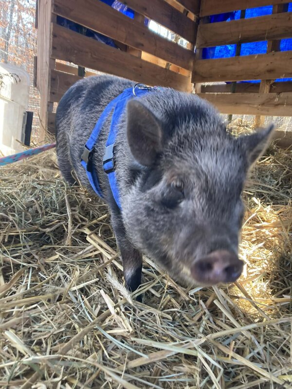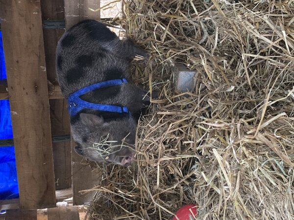Wilbur is a sweet boy looking for a forever home! He's currently in a foster home because his original home desperately needed a safe place for her piglet after her dogs were going after him & trying to kill him. He's safe at the foster home, but they do not have a good set up for a pig and cannot keep him long term. Wilbur has met an 11 year old in the home; while he wasn't mean, he was a little nervous around her. Slow introductions to kids would be ideal for this shy boy. He's never met any cats in the foster home, but he does not seem like a fan of dogs which is not surprising considering his past history of being mistreated by them. (Dogs and pigs should always be supervised and never left alone when together.) Wilbur is neutered, current on routine vet care, and up to date on shots. He's harness trained, too!