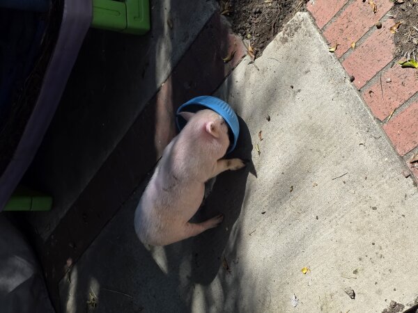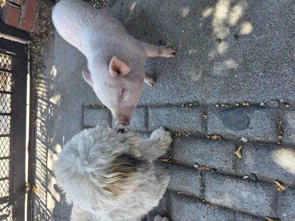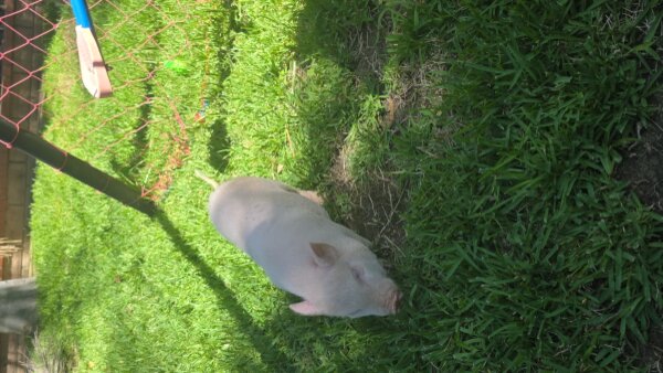 Winston is a young intact male who likes to run around and dig. He was taken in by the current home 2.5 months ago, but he's a bit more than they anticipated. He's done well with the 5-year-old child in the family, as well as with dogs. (Dogs and pigs should always be supervised and never left alone when together.) Winston is in need of a home where he'll be able to get neutered and get those pesky hormones out of his system.